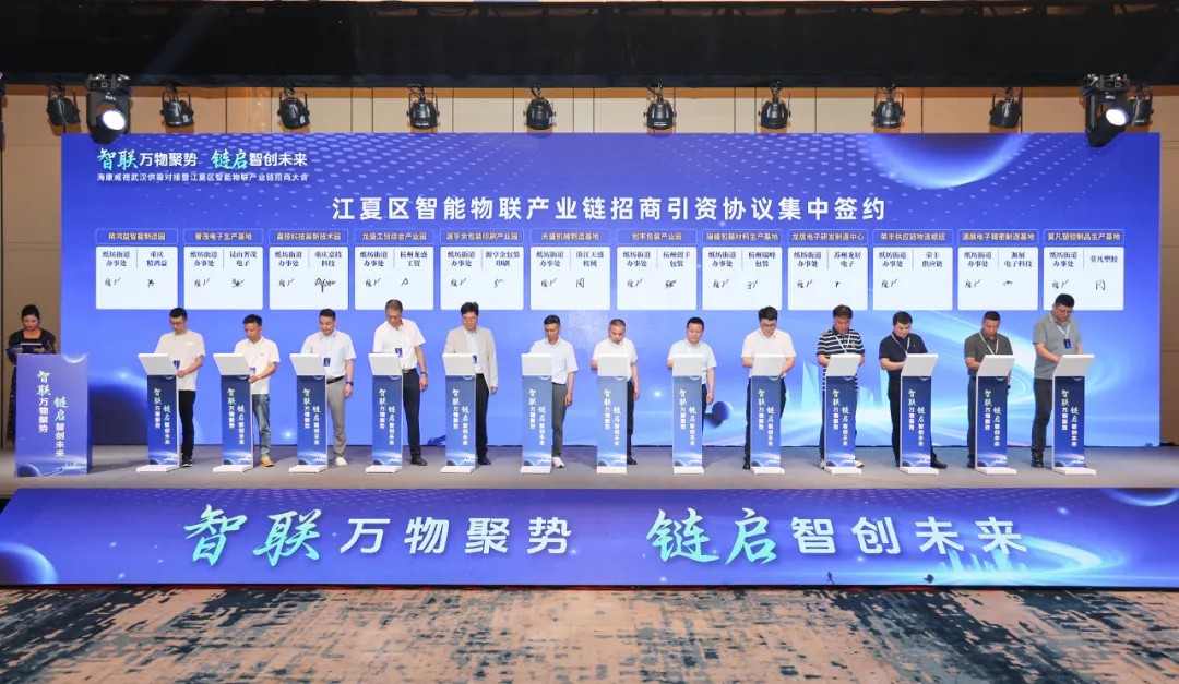 本次大会的重头戏是江夏区智能物联产业链招商引资协议集中签约活动。江夏区纸坊街相关负责人与12家企业代表签约。此次签约的12个项目分别为:精鸿益智能制造园、奢贸电子生产基地、嘉技科技高新技术园、龙盛工贸综合产业园、源亨余包装印刷产业园、天盛机械制造基地、创丰包装产业园、瑞峰包装材料生产基地、龙居电子研发制造中心、荣丰供应链物流枢纽、源展电子精密制造基地、莫凡塑胶制品生产基地。这些项目的落地,标志着江夏区"设备智造—数据赋能—场景应用"的智能物联生态闭环正式贯通,形成"大企业顶天立地、小企业铺天盖地"的创新矩阵,延续了江夏区"331X"产业战略,进一步巩固了江夏作为武汉"智能物联产业核心承载区"的战略地位。