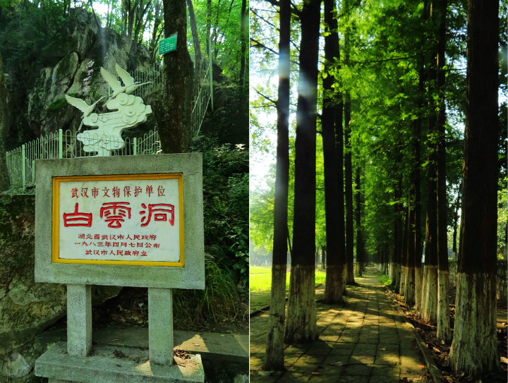 【白云洞】 白云洞位于江夏区纸坊街八分山南,是一个前后贯穿的天然溶洞,俗称石洞。全长约 300 米,分前洞、中洞、天井(天窍、天窦)和后洞四部分。洞口朝南,呈圆形。洞口右上壁刻有“白云洞”三字,为明代兵部尚书、江夏人熊廷弼所书。洞口两旁原有一对武士石雕,是朱元璋驻兵于此攻打武昌后所建。前洞内右侧有两支洞,《江夏县志》称为凉洞和暖洞。前洞后部有一石窟,中奉观音雕像,高丈余,是为无梁殿,殿名三字俱逾尺,亦为熊廷弼手书。石窟寺在江南少见,而像这样建于岩洞深处的石窟寺,更是一绝。中洞是一长形通道,洞壁全为钟乳石。穿过中洞,即到天井。《江夏县志》载:“人进洞陈折半里,仰见天窦。”所谓“天窦”,是洞顶有“天窗”通外,外边天光射入洞中。在天井左石壁上刻有“雷门洞开”四字。后洞为白云洞出口处,有两个出口,一为北口,一为东口。出北口,豁然开朗青山叠翠。出东口,向上攀登可达八分山顶。洞内石壁上有明、清人石刻多处,如“两间磅礴,一个崆响”“足飞”等。清咸丰年间罗泽南驻军于此,刻有“水流云在”四字。