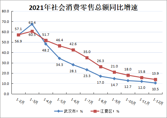 1-12月,全区社会消费品零售总额累计完成348.67亿元,同比增长13.9%,较武汉市平均增速高3.4个百分点,恢复至2019年同期水平的96%。