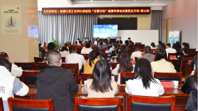 4月9日下午,江夏区第一人民医院(协和江南医院)“甘霖行动”之健康科普巡讲惠民生活动(庙山高新技术产业园站),在江夏经济开发区庙山高新技术产业园会议室举行,武汉协和医院及协和江南医院近10位专家教授带来了精彩的健康科普知识讲座,来自园区的企业职工、村医居民等120人余参加。江夏经济开发区党工委委员、副主任段晓珍,党工委委员刘龙腾,江夏区第一人民医院(协和江南医院)院长田洪涛、副院长韩传钢等领导出席开幕式,开幕式由协和江南医院党委委员彭才华主持。