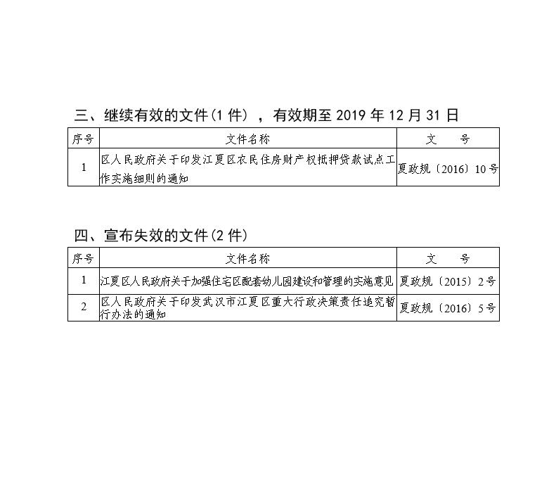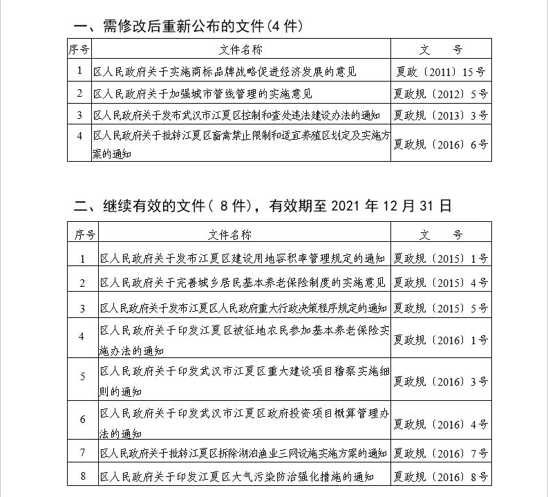 根据《国务院办公厅关于加强行政规范性文件制定和监督管理工作的通知》(国办发〔2018〕37号)和《省人民政府办公厅关于开展涉及产权保护的规章和规范性文件清理工作的通知》(鄂政办函〔2018〕47号)等文件精神,区人民政府对截至2018年6月30日止现行有效的区人民政府规范性文件进行清理。经研究,决定对《区人民政府关于实施商标品牌战略促进经济发展的意见》(夏政〔2011〕15号)等4件规范性文件修改后重新公布;对《江夏区被征地农民参加基本养老保险实施办法》(夏政规〔2016〕1号)等9件规范性文件予以保留继续有效;对《江夏区人民政府关于加强住宅区配套幼儿园建设和管理的实施意见》(夏政规〔2015〕2号)等2件规范性文件宣布失效(具体目录附后)。